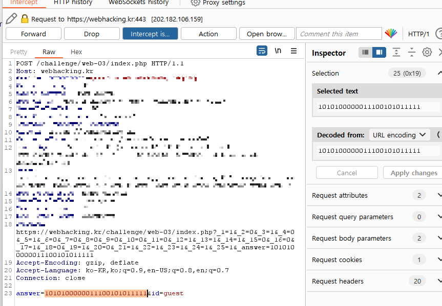 burpsuite에 아래와 같이 패킷이 잡히게 됩니다. 그러면 answer="1010100000011100101011111"를 answer 값을 아래와 같이 변경한 후 [Forward]해줍니다.