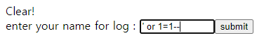 그러면 'clear!'이라는 메세지와 함께 name을 입력받고 있음을 확인할 수 있습니다.