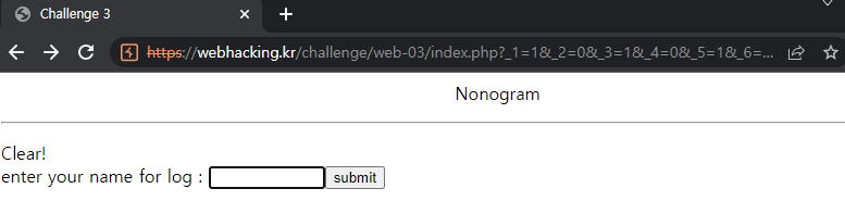 webhacking.kr의 old-3의 문제 페이지를 열면 다음과 같이 네모로직을 할 수 있는 페이지가 나옵니다.