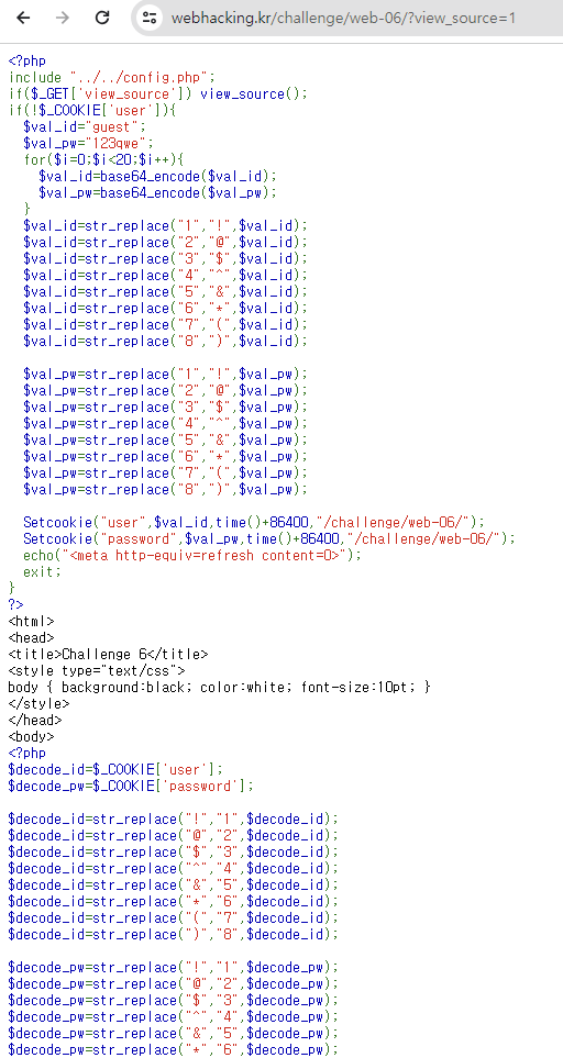 (첫 번째 소스코드에서 분석했을 때, user과 password쿠키는 각각 'guest'와 '123qwe'가 인코딩과 치환 후 저장된 쿠키입니다.)