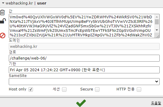 위에 과정을 거친(인코딩과 문자치환) val_id와 val_pw 변수를 각각 user와 password 쿠키 값으로 설정해줍니다. 또한 쿠키의 만료를 86400초로 설정하고, 쿠키 경로는 /challenge/web-06/으로 설정합니다.