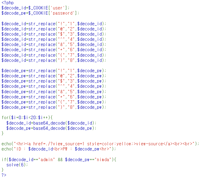 - 다음으로 사이트에서 'user'과 'password' 쿠키값을 가져와 [문자를 숫자로 치환한 후 base64디코딩 20번]한 값을 사이트 화면에 보이도록 설정합니다. 또한 변경된 값이 각각 admin과 nimda일 경우 문제가 풀립니다.