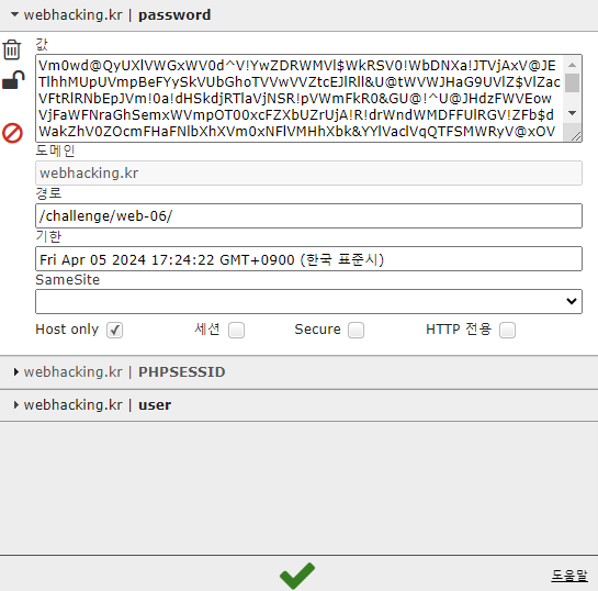 앞에서 구한 값들을 각각 user와 password 쿠키에 넣어서 초록색 체크버튼을 누른 후 새로고침을 진행합니다.