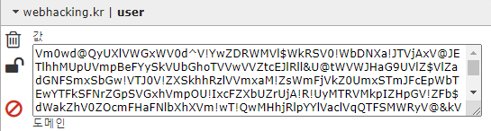 'user'와 'password'쿠키값을 각각 확인해보면 다음과 같습니다. 각 값이 의미는 guest와 123qwe를 base64 인코딩 20번 후 숫자를 문자로 치환한 값입니다.