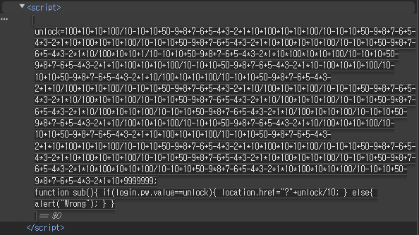 문제는 간단합니다. F12를 눌러 Script부분을 확인해보면, unlock이라는 변수를 확인할 수 있습니다. 또한 함수부분(function)은 pw값이 unlock과 같으면 해결된다는 것을 알 수 있습니다.