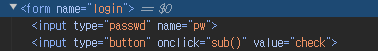 문제에서 입력값을 받는 부분이 하나 밖에 없어서 바로 넣으면 되지만, 왜 저 칸이 pw인지 궁금하다면 form태그를 확인해보면 됩니다.